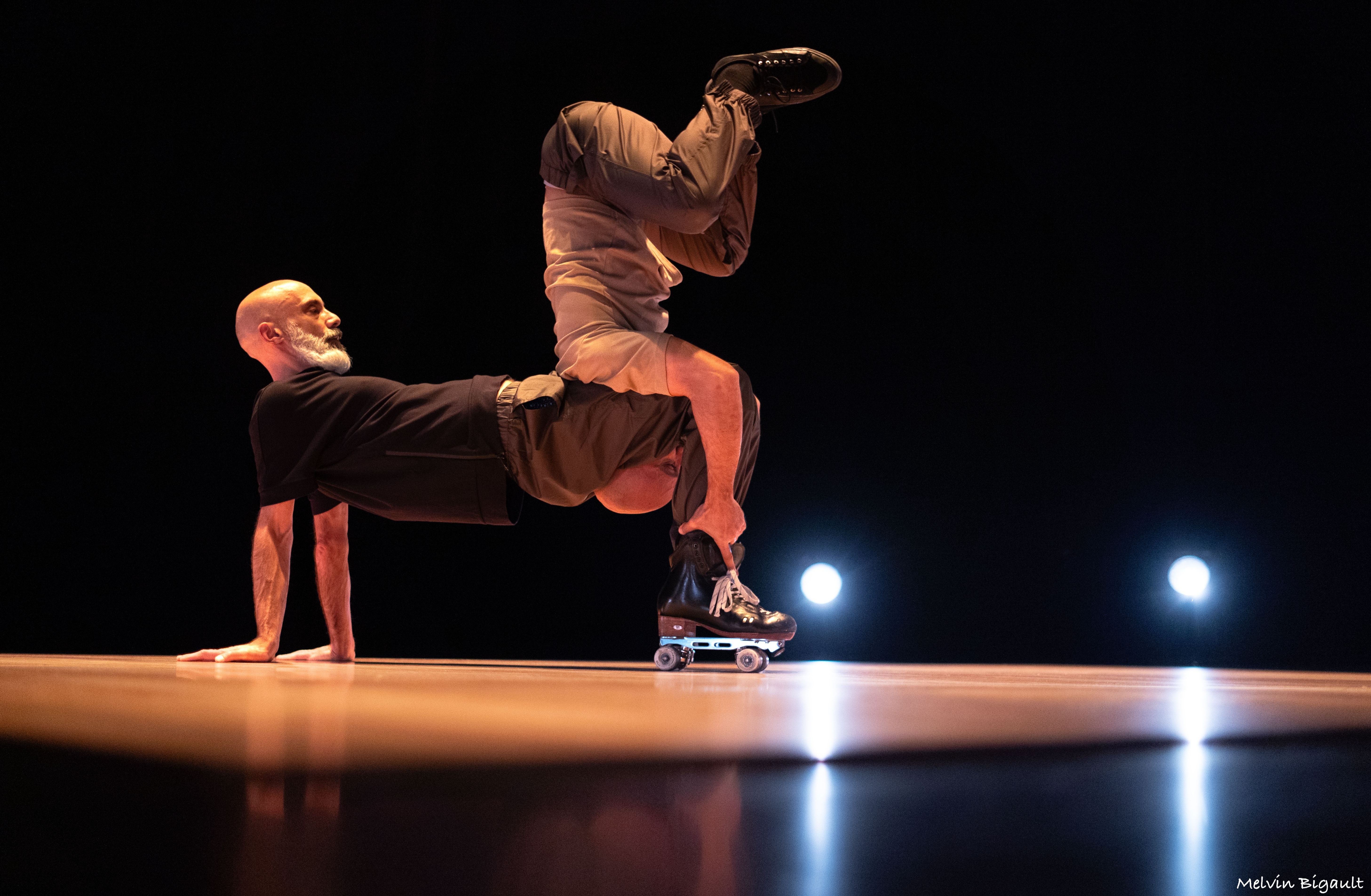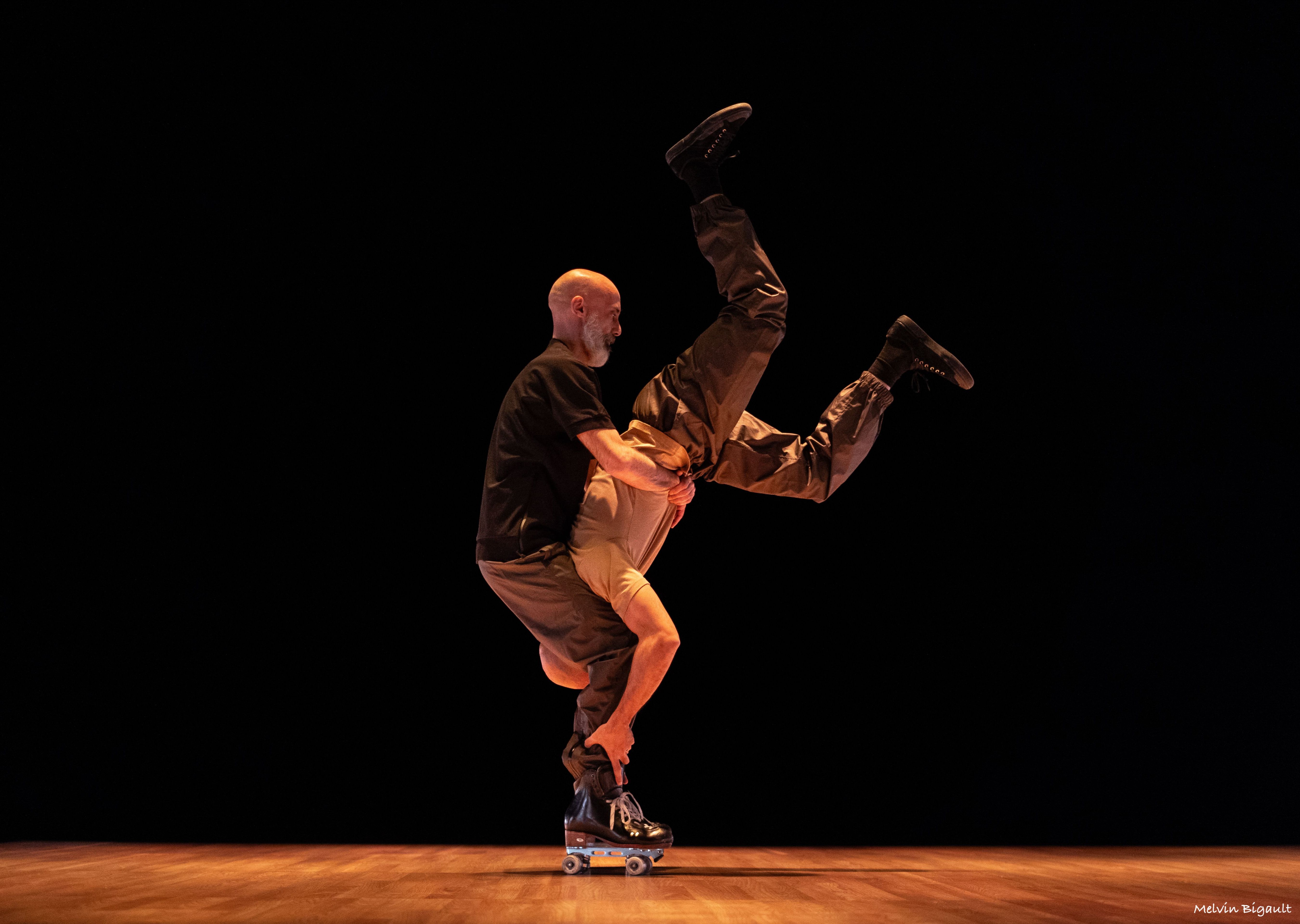 Si je ne porte pas de patins contrairement à mon partenaire, nous sommes tous les deux soumis à l’inertie de ses rollers. Il y a donc la contrainte de mettre en jeu l’équilibre et la technique propre à cette discipline, une hybridation du geste qui a pris racine dès les premières étapes de création. Si la danse est résolument contemporaine, ce duo est d’influence hip-hop quoique circasienne. Quoiqu’il en soit, cette création est habitée par la volonté d’aller au delà des conventions. A la manière d’un pas de deux revisité, des séquences basées sur des jeux d’interdépendance et des portés aussi farfelus les uns que les autres se dessinent en décalage avec l’apparition d’images fortes, une approche permettant de toucher à l’humain et à la société en contournant l’usage d’un ton grave. Frôler, provoquer, s’agripper... cette rhétorique de l’action servira la recherche chorégraphique et l’univers de cette pièce dont l’intention motrice est de faire écho à notre ère bouillonnante tout en portant un regard sur les grandes avancées humaines de notre temps." Adel El shafey